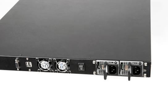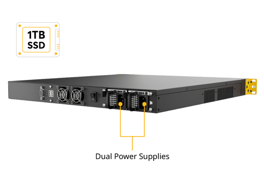 Dual hot-swappable power supplies ensure uninterrupted operation and rapid failover in case of power loss.
