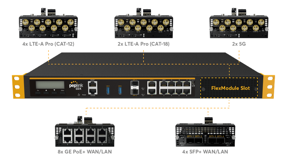 Use SDX FlexModules to aggregate SFP+ and Ethernet uplinks into a highbandwidth SpeedFusion VPN SD-WAN overlay between branch offices, data centers, and cloud environments.​